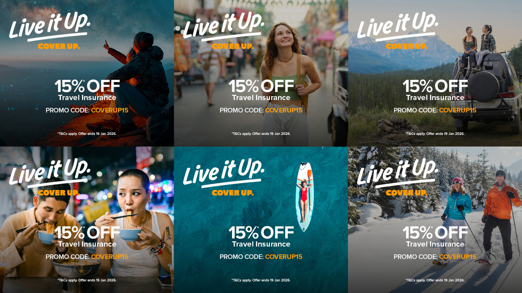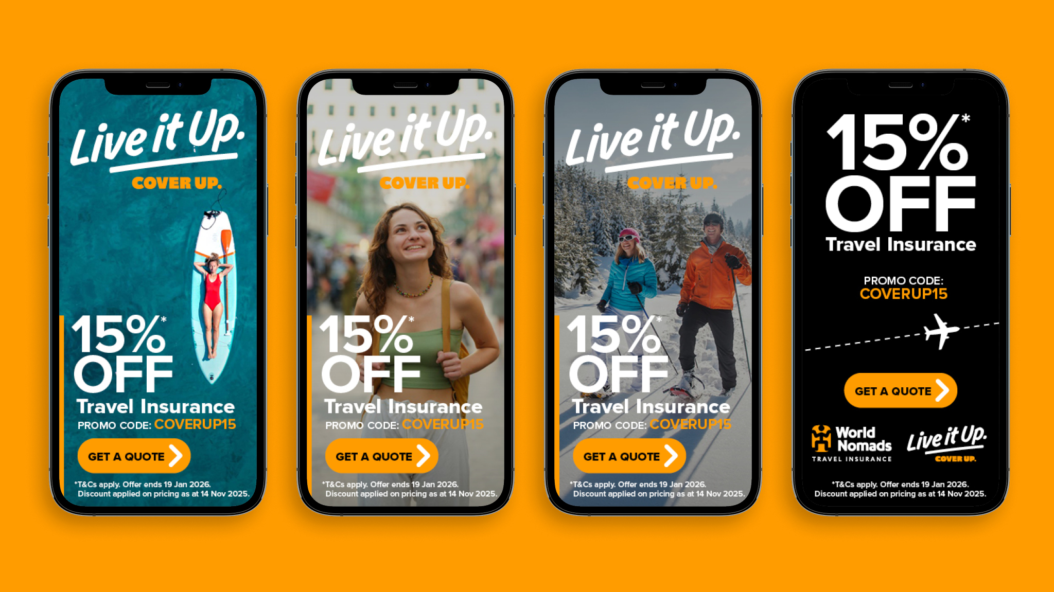 Given the campaign line ‘Live It Up. Cover Up.’ for World Nomads’ 2025 end-of-year sales campaign, Grin developed a dynamic design system that extended Live It Upacross a wide range of holiday activities, allowing ads to be tailored to different audiences. The core campaign animation cycled through these activities, seamlessly integrating message and footage for maximum impact.